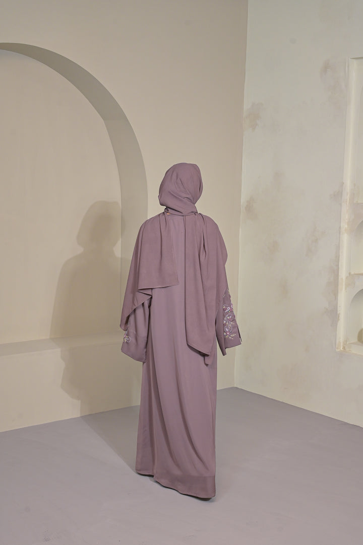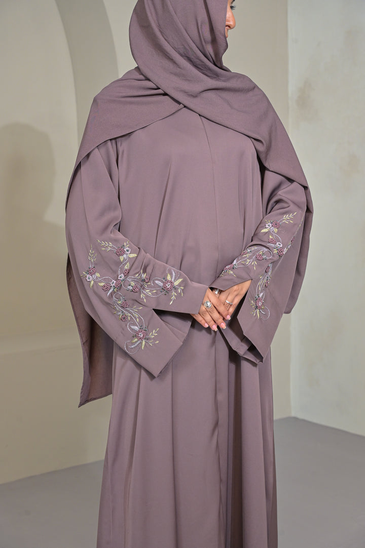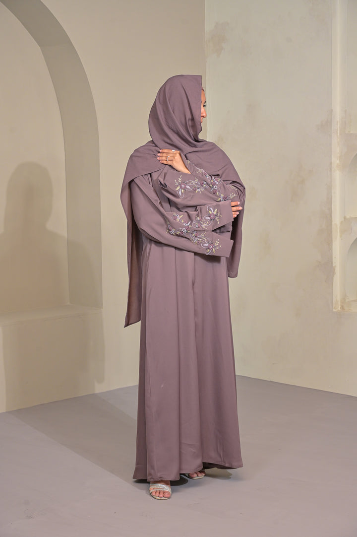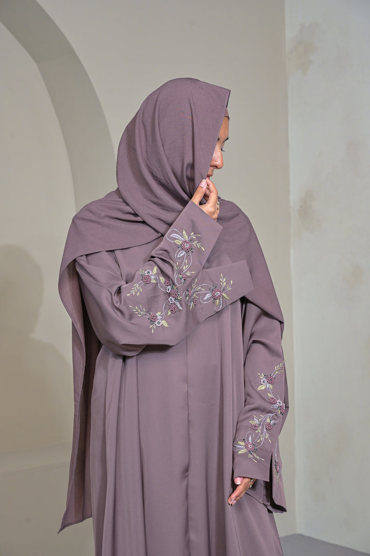 An exquisite mocha abaya, adorned with intricate hand-done thread embroidery. Its subtle yet sophisticated detailing elevates the straight silhouette, creating a refined, conventional look. Each abaya is crafted with meticulous care, making it a one-of-a-kind piece for elevated everyday wear or special occasions.