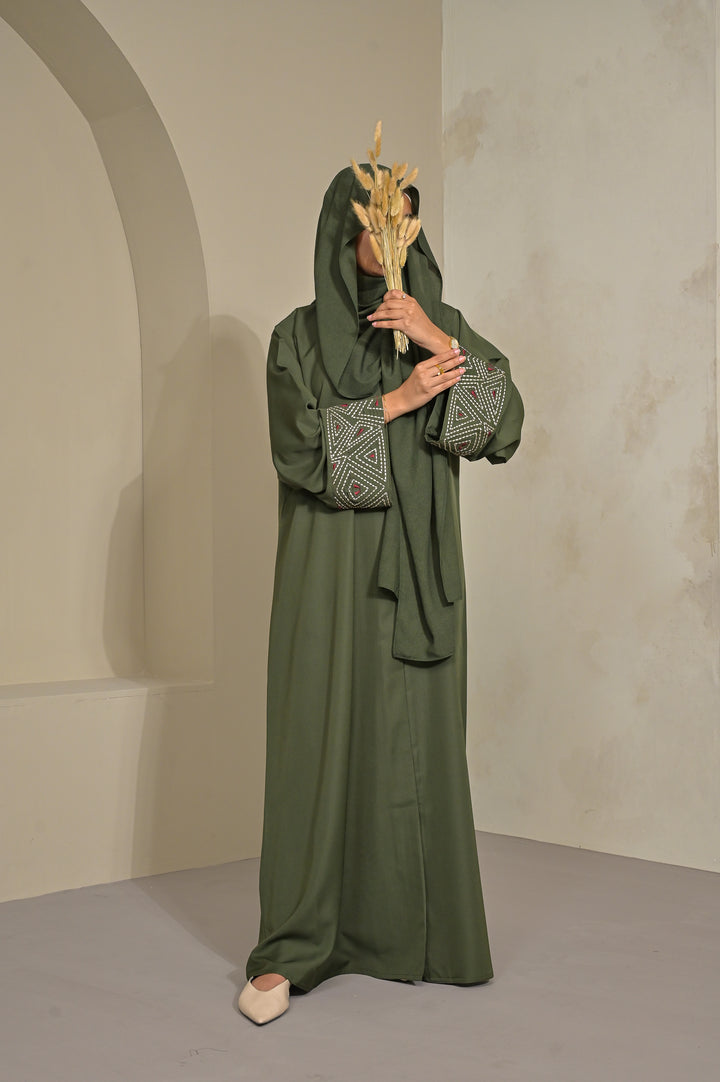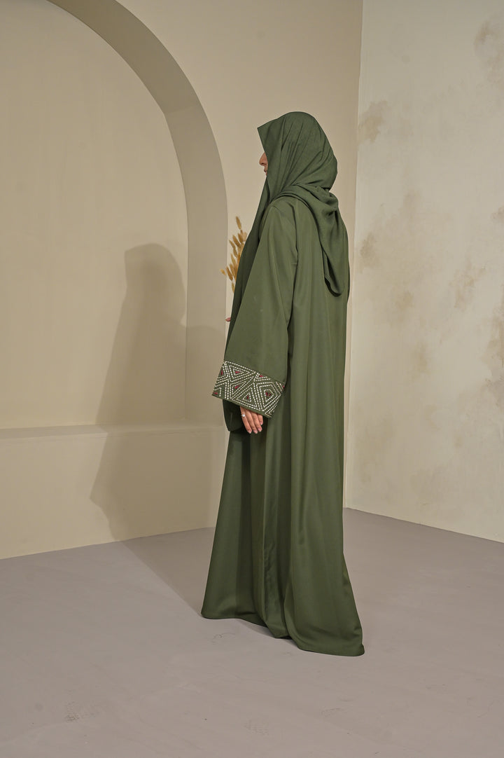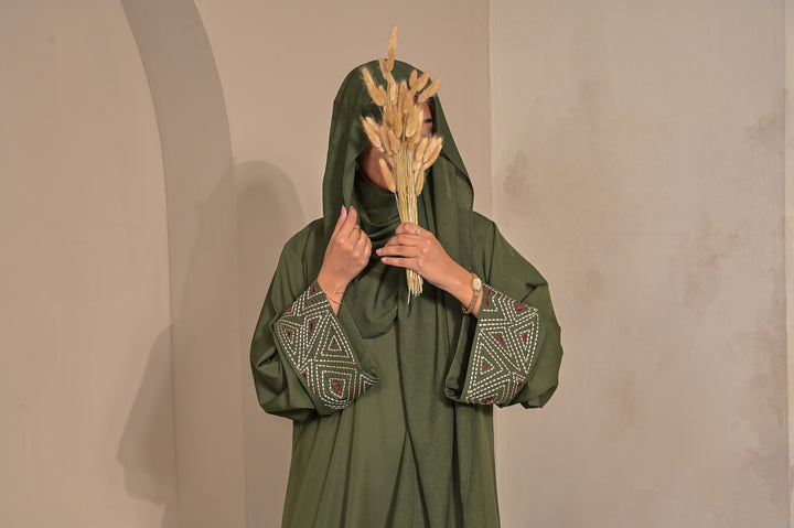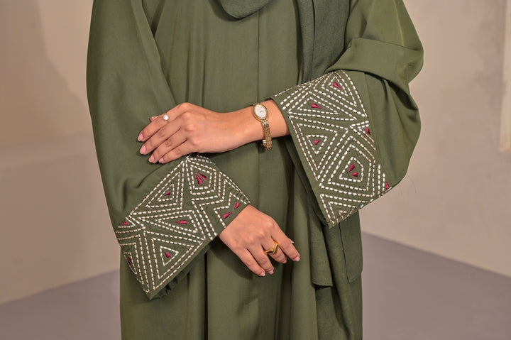 An elegant olive Abaya accented with geometric embroidery on the cuffs. Its clean lines and fluid drape reflect Abaa’s signature balance of modern refinement and timeless grace.
