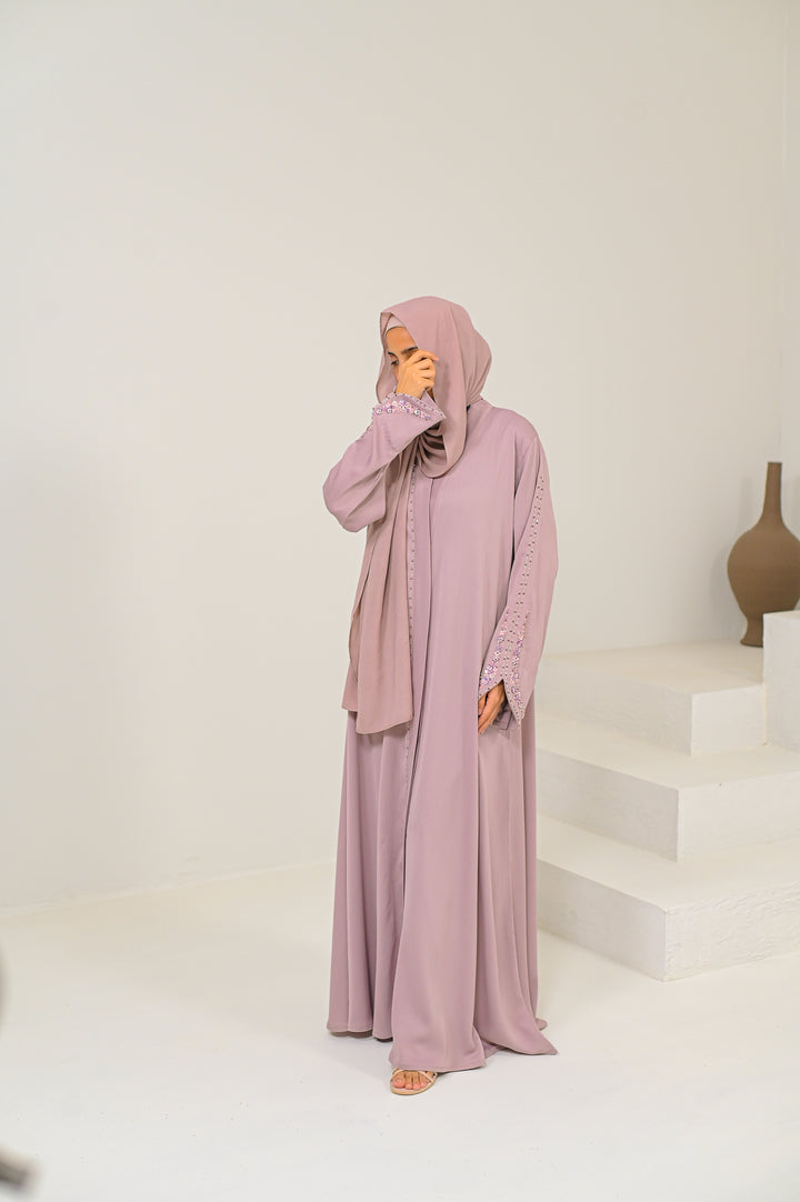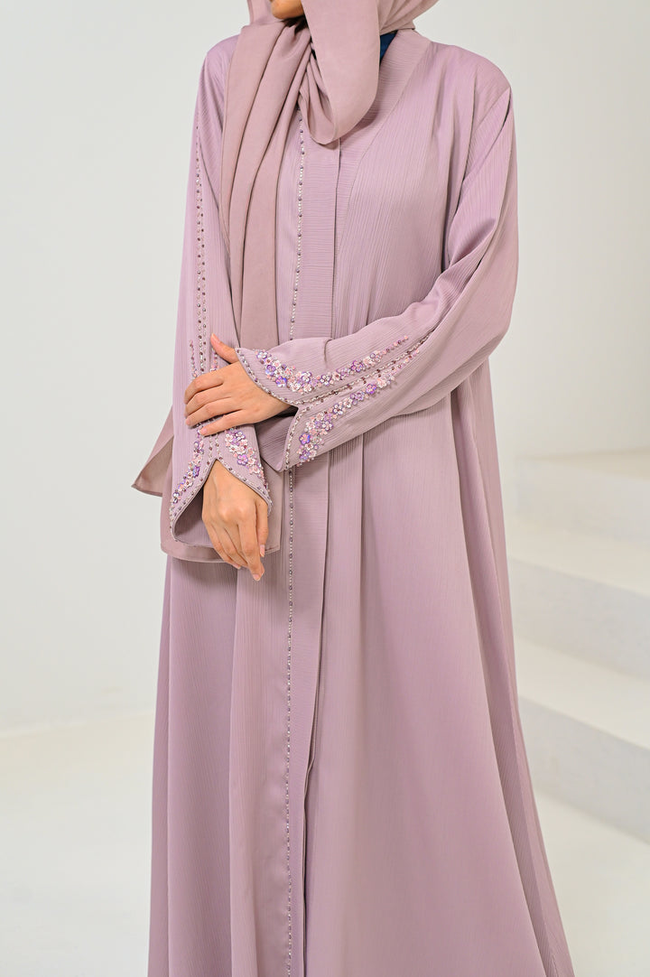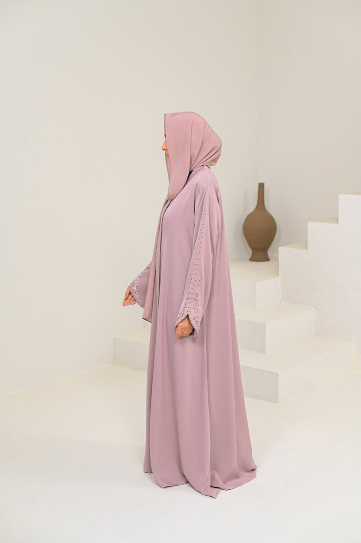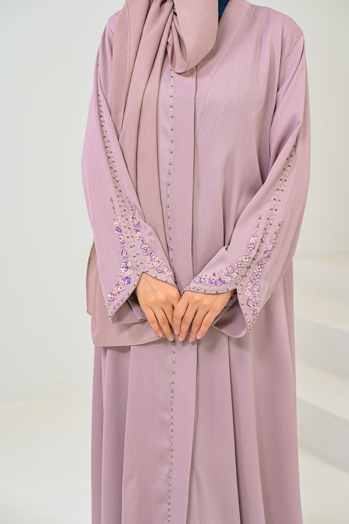 Design Details: Rosalie is a soft blush pink abaya illuminated with sequins in layered shades of pink and purple, creating a gentle, ethereal shimmer with every movement. The tonal sequin work adds depth and dimension without overpowering, giving the piece a romantic, refined glow.