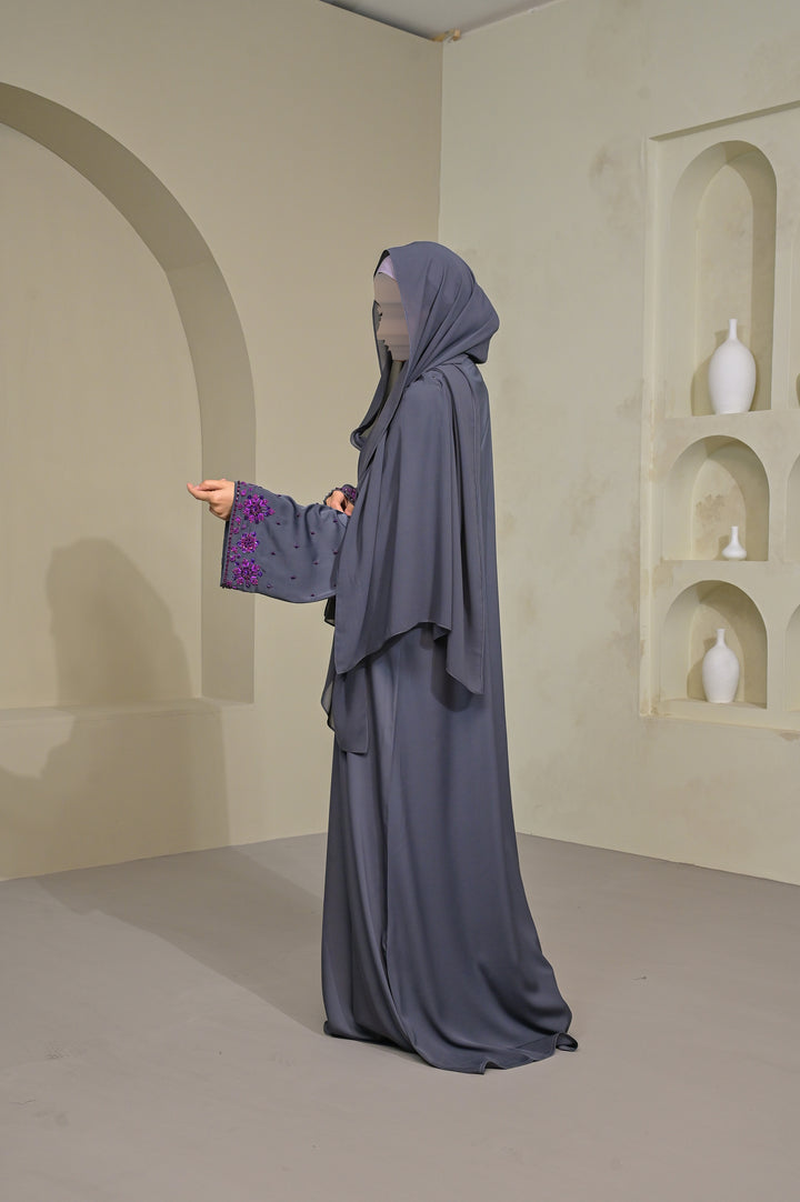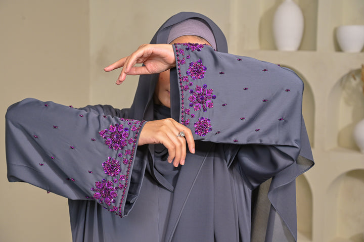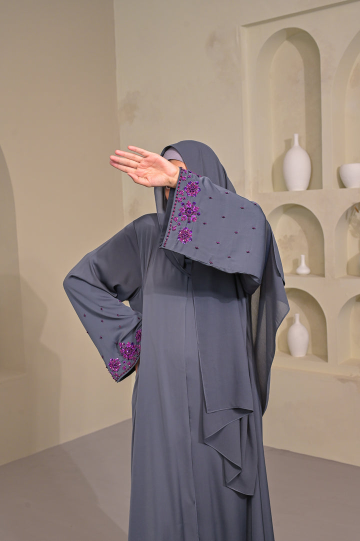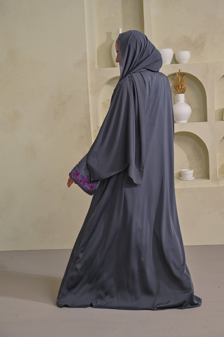 Design Details: Sahar Abaya is a refined statement piece featuring embellished sleeves, a full button-down front, and a V-shaped neckline secured with invisible buttons for a clean, uninterrupted look. Its smooth, stitch-less construction creates a modern, polished silhouette suited for formal occasions and elevated smart-casual wear. The embellishment is crafted using high-quality mixed materials: cut dana and more, requiring hours of meticulous, hand-done craftsmanship. Hijab is included with the abaya.