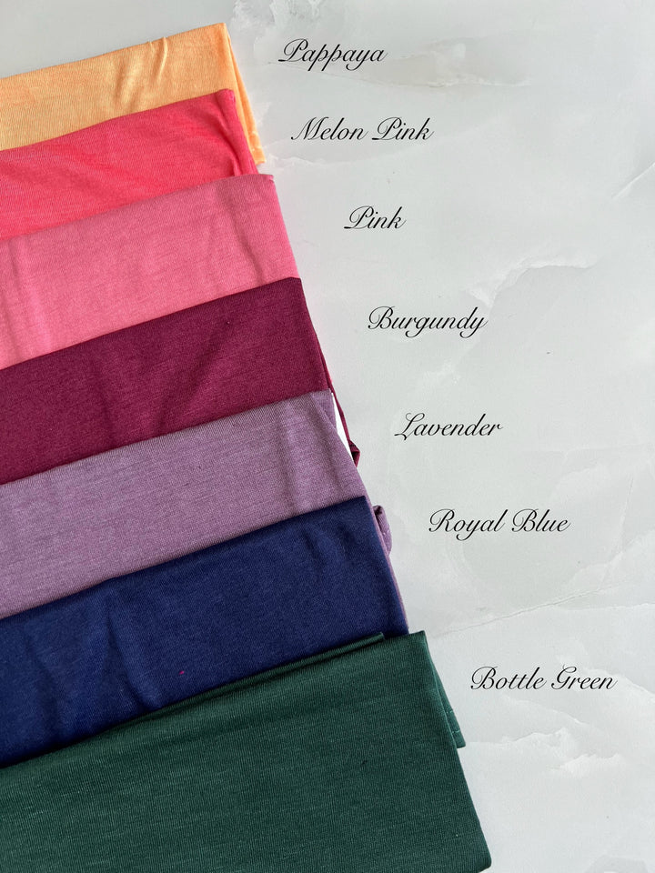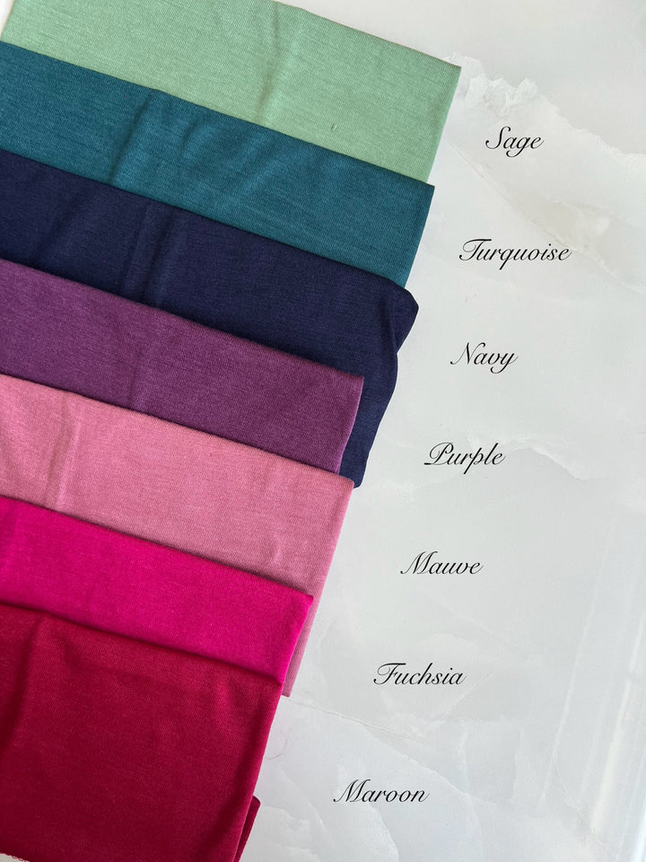 Black, White, Dark Grey, Light Grey, Brown, Maroon, Fuchsia, Lavender, Navy, Sage, Turquoise, Pink, Papaya, Mauve, Burgundy, Melon, Purple